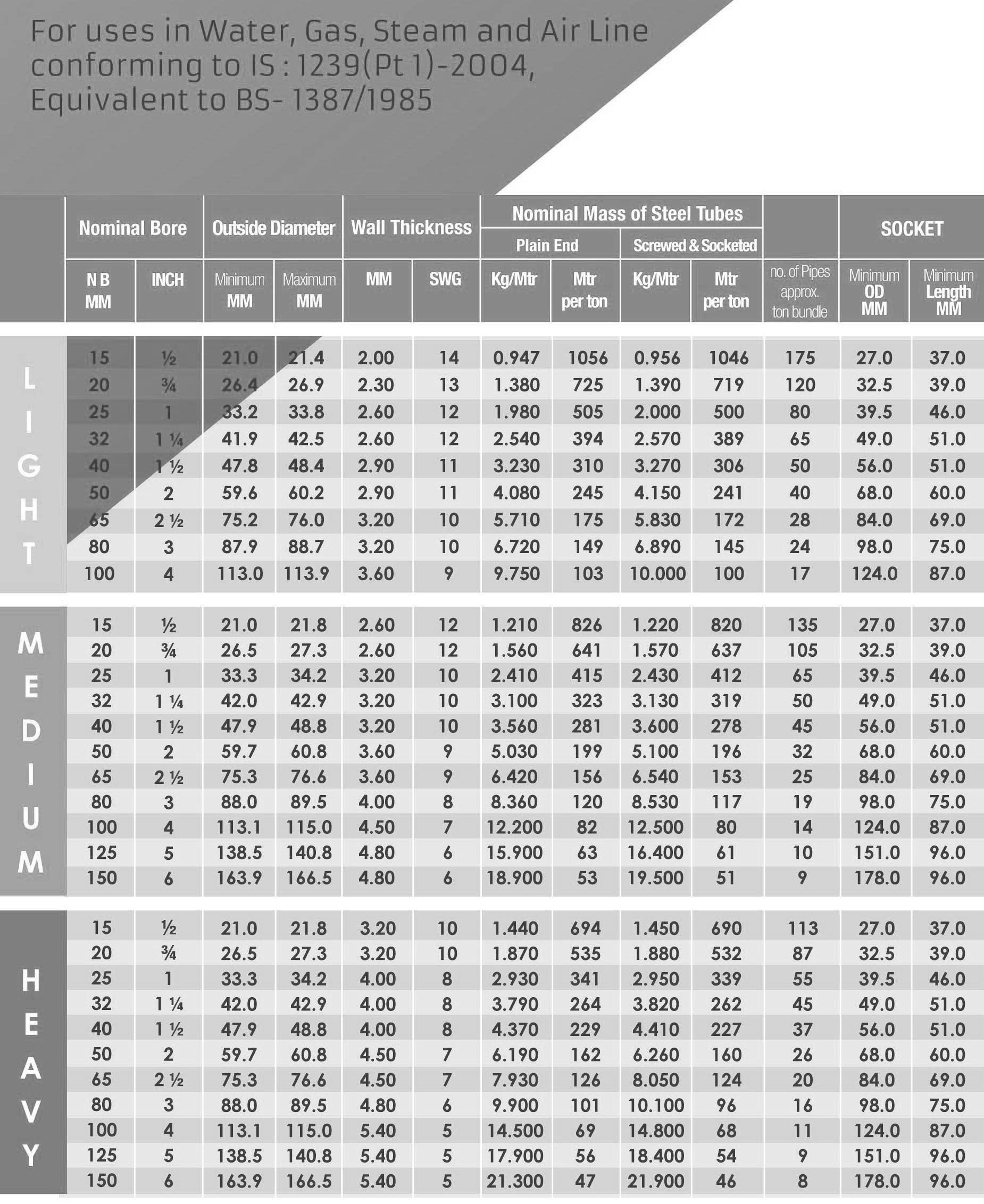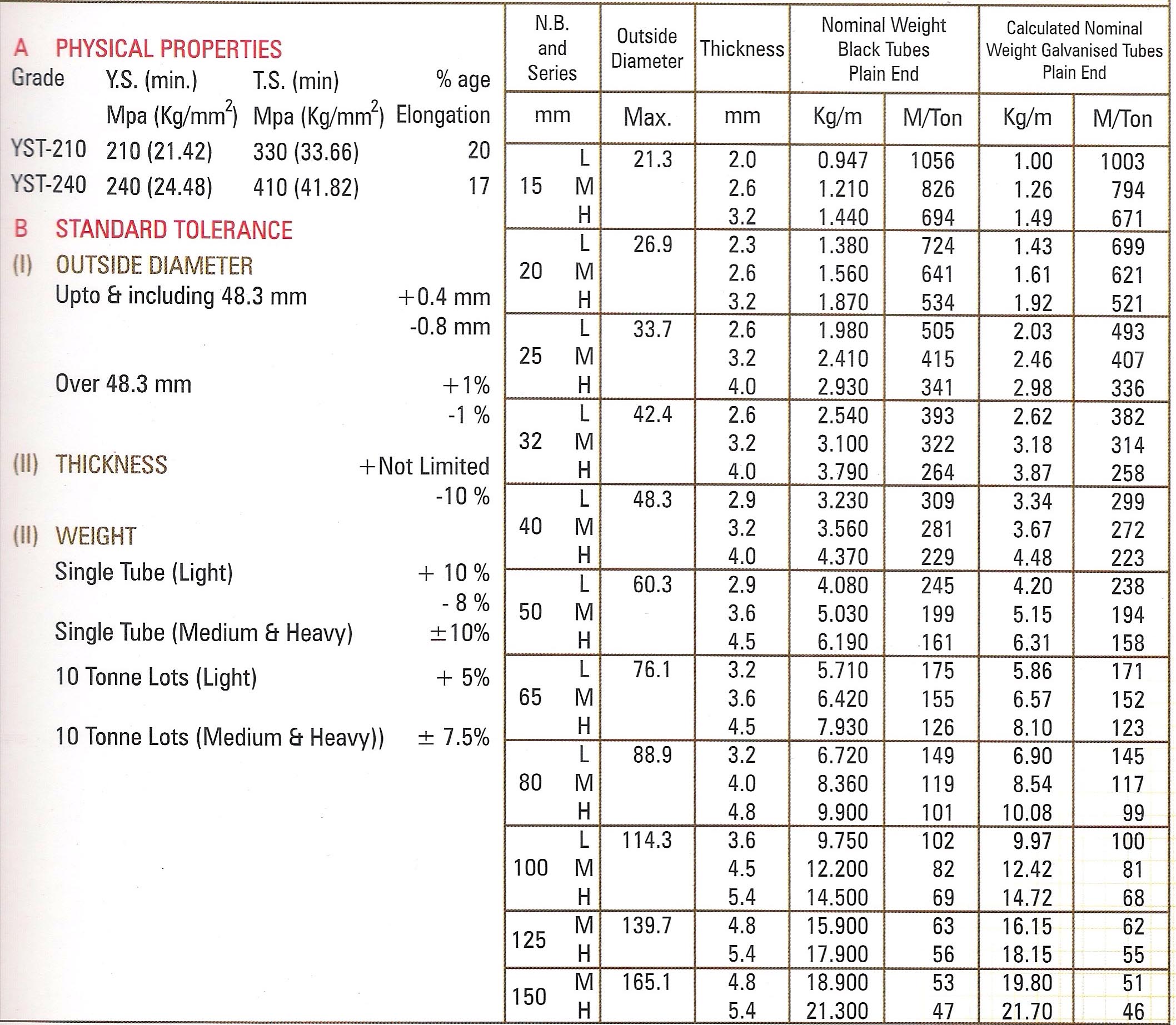 As per the below mentioned specifications our products are manufactured for various applications like Agriculture, Cattle Pen Tubes, Chilled Water Systems, Construction Tubes, Conveyor Roller Tubes, Fence Tubes, Fire Fighting Applications, Gas & Water Tubes, Green House Tubes, Handrails, Hollow Sections Structural tubes, Lighting poles, Mechanical & General Engineering, Parking Posts, Scaffolding, Space frames, Sprinkler systems, Submersible / Deep Water & Casing pipes, Telecommunication poles, Tubular Poles etc.