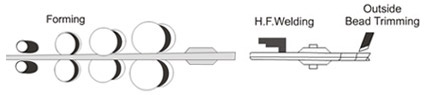 Welding In this stage, the open edges are heated to the forging temperature through high-frequency, low-voltage, high current and press welded by forge rolls making perfect and strong but weld without filler materials.