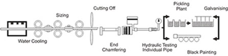 Steel strip in coil, which has been slit into the required width from wide strip, is shaped by a series of forming rolls into a multiple length shell. The longitudinal edges are continuously joined by high frequency resistance/induction welding. The cut pipe is straightened and squared at both ends. These operations are followed by ultrasonic inspection or hydrostatic testing.